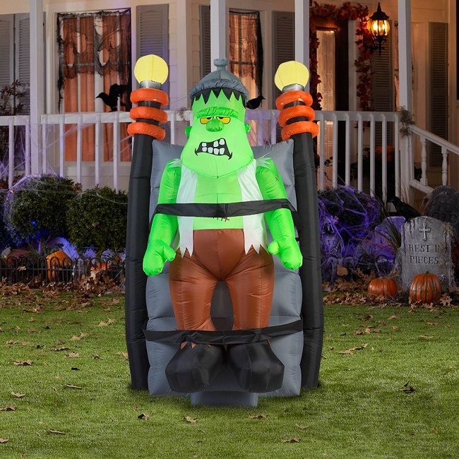 Animated Frankenstein shakes and lights blink on and off creating a short circuit effect.